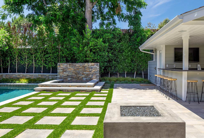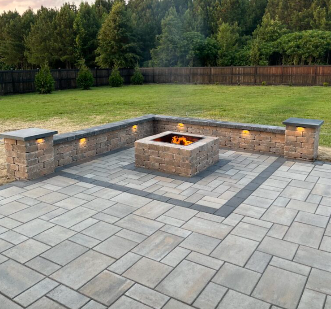 Modern paver patio with built-in seating and fire pit designed by Mundo Landscaping in Tucson, AZ — example of expert hardscaping and outdoor living design.